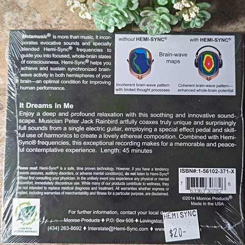 It Dreams In Me~Peter Jack Rainbird. "It Dreams In Me" is a Hemi-Sync album featuring musician Peter Jack Rainbird. It combines Rainbird's soothing, ethereal guitar music with Hemi-Sync frequencies designed to promote relaxation and peaceful contemplation. The album is known for its calming, non-verbal soundscape, and is often used for sleep, meditation, and stress reduction. "It Dreams In Me" is a Hemi-Sync album featuring musician Peter Jack Rainbird. It combines Rainbird's soothing, ethereal guitar music with Hemi-Sync frequencies designed to promote relaxation and peaceful contemplation. The album is known for its calming, non-verbal soundscape, and is often used for sleep, meditation, and stress reduction. The Hemi-Sync frequencies embedded in the music are designed to guide the listener's brainwaves into specific patterns associated with relaxation and sleep.