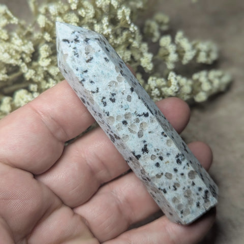 Archangel Gabriel Stone Pillar CRAGWD17. I nicknamed this stone Archangel Gabriel Stone because of its energies of connection to ascended beings and higher wisdom, communication and protection. It is a new find comprised of snow quartz, smoky quartz, blue quartz and black tourmaline. Archangel Gabriel’s name means 'God is my strength'. As the patron of communications, Archangel Gabriel is the messenger angel, acting as a messenger of God. Archangel Gabriel Stone is an energy amplifier, said to bring the energy of the stars into the soul. It is considered a stone of harmony, and is thought to facilitate communication with spiritual and other-worldly masters, teachers, & healers. It can be programmed as a constant prayer or intent generator. It transmutes negative energies in one’s environment. It is a good stone for “keeping things clear” by purging the atmosphere of unspoken resentments or suppressed conflicts. By balancing the Throat Chakra, it enhances communication between upper and lower Chakras, angelic beings, and ascended masters. It also helps to improve one's communication skills, including not only communication with others, but also communication from the ascended to the spiritual self. It also clears the energy systems of any thoughts or psychic debris that could cause blockages or imbalances if allowed to remain. It is a process of "energetic housecleaning" that is vitally important to anyone who strives for connection to their spiritual path. 101mm x 27mm x 22mm.