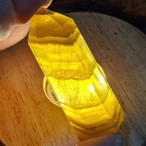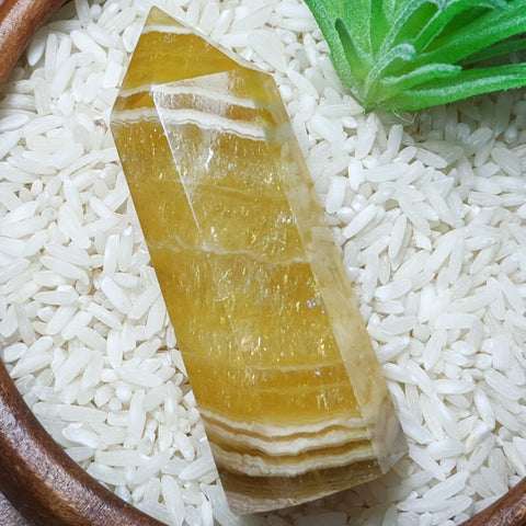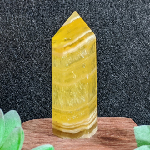 Banded Yellow Fluorite Generator~ CRYFLR06. Yellow Fluorite stimulates the Solar Plexus Chakra. It is wonderful for those with overactive imaginations, helping one understand the fine line between attainable dreams and illusions by directing intellect and effort into tangible achievements. Use to keep daydreams and fantasies in check, especially in the workplace. It is particularly empowering for overcoming self-defeat or a constant need to compare oneself unfavorably with others. It reduces jealous tendencies that stem from insecurity and lack of love. It is a crystal of unity, intellect and creativity. It is ideal for overall cleansing and repair of the auric field, and for activating and energizing all chakras. It calms a chaotic mind and promotes freethinking, flexibility, and freedom of choice. It empowers one to verbalize their ideas and needs with confidence, and to embrace self-sufficiency by not resting one’s happiness in the hands of others. Meditation with this mineral can help reveal the truth of a relationship. It is an excellent ally for “Indigo Children” to experience simplicity, safety and love on this dimension, and is a great crystal for gaining access to and traversing alternate realities. 65mm x 25mm x 21mm