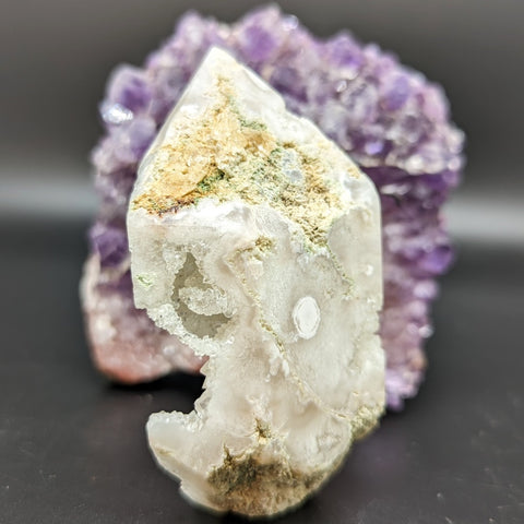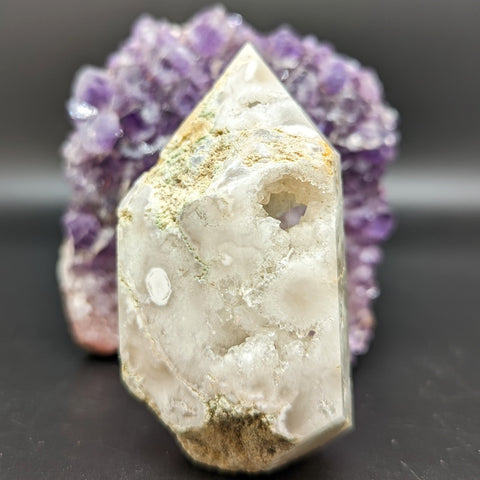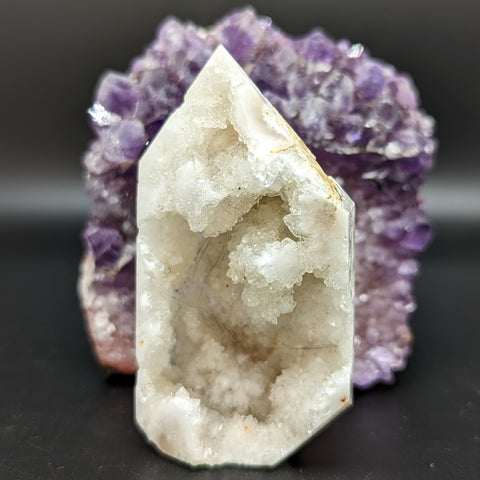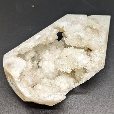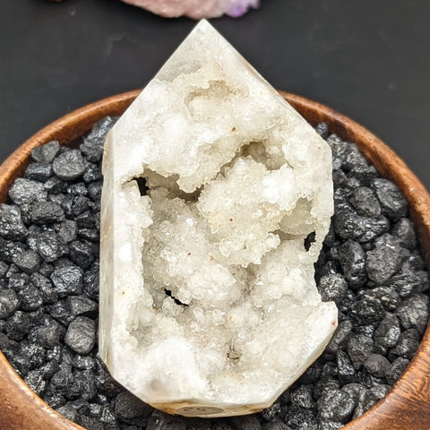 Druzy Quartz Generator~CRDQGEN3. Druzy is the name for tiny crystals of a mineral that form on the surface of another stone. The metaphysical energy of Druzy crystals is similar to that of crystal clusters. As any type of cluster, they are suitable for group meditation, spiritual workshops, or any other form of joint spiritual work. Whenever you need to harmonize a group of people toward a common spiritual goal, you can use a Druzy crystal. As a type of Crystal Cluster they also bring harmony to groups. They have energy that is especially helpful for Spiritual worship and Lightwork. Like other types of clusters, they can be used to empower the energy of other crystals and stones. Quartz is an an energy amplifier and transmitter, and is said to bring the energy and harmony of the stars into the soul. It is thought to facilitate communication with ascended masters, teachers, and healers. It can be programmed as a “constant prayer or intention generator”, sending our highest thoughts and wishes out to the Universe. Because these crystals are an energy amplifier on an energy amplifier, they are quite powerful tools, especially when used to focus, direct, amplify and send light energy directly into chakras to clear and charge. 67mm x 42mm x 26mm