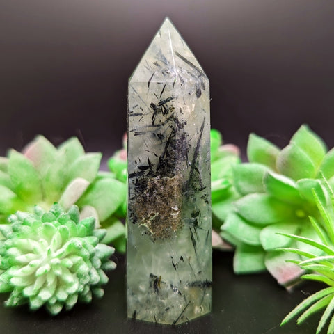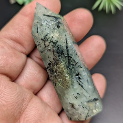 Epidote in Prehnite Generator- CREPPRG5. Prehnites' vibration most closely resonates and resembles the energy of Reiki, amplifying energy, shielding, empowering, and enhancing Divine guidance and inner knowing. It is thought to help one remain “present” and promote creative visualization. The meaning of Epidote’s name comes from the Greek word for ‘increase’. Epidote is an attraction stone, so it will manifest that which matches whatever you choose to emanate. If you are loving and romantic, it will attract more love and romance to you. It will enhance the energy of whatever it touches, including other stones. It increases perception and interaction with spiritual beings, and brings spiritual growth. It is a great stone for releasing negativity and raising one's vibrational energy. It is helpful for those stuck in modes of depression, hopelessness, or other negative thinking pattern. It can inject a sense of hopeful optimism into one's emotional body, helping to bring the mind into a higher vibration. Crystal healers like to work with it for its ability to clear congestion and energy blockages in the physical and subtle bodies. It will help to balance and stabilize the energy flow in the body. Epidote is an excellent stone for attunement with nature and her healing qualities. It puts forth a simple, calming, grounding, back to Earth vibration, which is particularly good for those living in a high energy, city setting. It’s also a very powerful dream stone that will give you lucid dreams and very restful sleep. It will help you remember your dreams so that you can apply their messages to your life. 83mm x 28mm x 24mm
