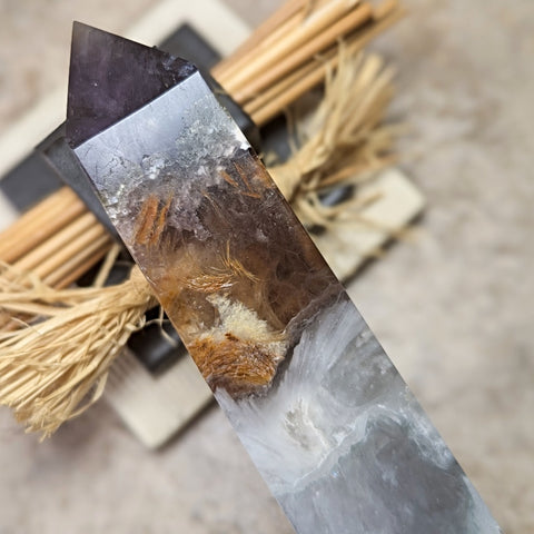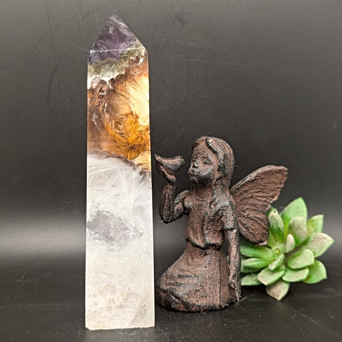 Fluorite, Scolecite & Pyrite Generator (RARE)~CRFSPG04. Purple Fluorite is said to be the most peace-giving color of Fluorite. It is dedicated to the devotional aspects of the mind that connect with Spirit, enhances mental acuity, stimulating the Third Eye Chakra in order to bring a logical & conscious awareness of the mental processes & how one thinks, an excellent crystal for focused meditation & boosts one’s intuitive & psychic abilities, a stone of protection, thought to become more protective the longer it is used, an ideal “Dream Crystal,” defending one from evil spirits & bad dreams, emanates a marvelous energy throughout the light body relieving stress, spiritual discomfort, & physical blockages, considered highly therapeutic for those who are uncomfortable being touched or examined, a dream talisman, providing insight & giving us a window to the soul beyond ordinary understanding, not only the wisdom of self, but focuses on our feelings & understanding our hidden yearnings. Yellow Fluorite may be used for finding “that which is lost”,wonderful for those with overactive imaginations, helping one understand the fine line between attainable dreams & illusions, particularly empowering for overcoming self-defeat or a constant need to compare oneself unfavorably with others, a crystal of unity, intellect and creativity, ideal for cleansing & repair of the auric field, & for activating & energizing all chakras, calms a chaotic mind, meditating with this mineral can help reveal the truth of a relationship, an excellent ally for “Indigo Children” to experience simplicity, safety & love on this dimension. Scolecite is Crown & Soul Star Chakra stone connected to psychic abilities, akashic records, journeying, meditation, & channeling spiritual messages, considered a stone of serenity, resonates with the Reiki symbol Hon Sha Ze Sho Nen, assisting healing sessions, & breaking through the illusory constructs of time & space, acts as an energetic bridge between the heart chakras of romantic partners.Yang energy is outward-focussed, whereas Yin energy is inward-focussed, & promotes self-love & self-healing. If you have spent a significant amount of time in Yang environments, such as high-powered work environments or social events, you may need a good dose of the Yin energy of a stone like scolecite to “recharge.” This is especially important for people who are introverted – that is, who gain their energy from being alone, will speed up the recharging process, helping you gather your energy & calm yourself so that you are focussed & ready for your next social or Yang-focussed activities. Pyrite encourages the flow of Earth energy (a purifier) into the body, increasing physical stamina and mental acuity, aids the process of manifestation & creation on all levels, nicknamed "fools gold", reminding us that "money isn't everything”, assists us in balancing creativity with logic, asks us to employ our "male energy”, & is considered the masculine power stone, a very protective stone, keeping out negative vibrations, shielding on a physical level from harm, repelling pollutants, while energizing the nourishing energies of the body, allows one to recognize the purity of the universe & to understand that each portion (or person) of the universe maintains an inherent perfection in order to allow the unfolding of impeccability, encourages the flawless ideal of health, intellect, & emotional well-being, symbolizes the warmth & lasting presence of the sun & promotes the recall of beautiful memories of love and friendship, assists one in seeing behind facades, promoting understanding of that which lies beneath words & actions. It is also helpful in enhancing memory. 153mm x 33mm x 34mm.