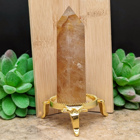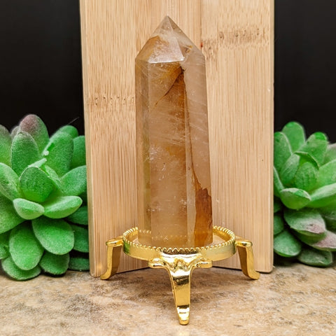 Golden Healer Quartz Generator~CRGHQG04. A true “golden healer quartz,” is defined as quartz containing an iron oxide coating in between or underneath layers of crystal. Coloration can range from a clear, pale yellow to lemon to (darker) mustard. Golden Healer Quartz are master healers, helping one to access the gold ray, the highest vibration of light the human body can receive and sustain. It is said to raise the body's vibrational level to dissolve and release blockages or foreign energies. It is thought to facilitate spiritual and multidimensional communication and healing. It is said to access the Vibrational level of Christ consciousness. 76mm x 24mm x 21mm