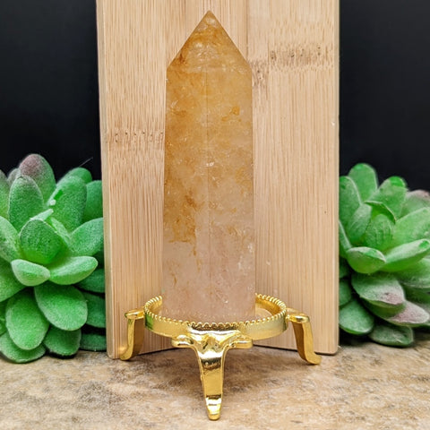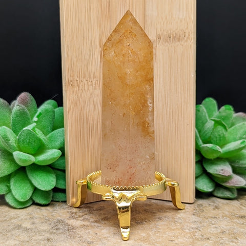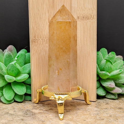 Golden Healer Quartz Generator~CRGHQG08. A true “golden healer quartz,” is defined as quartz containing an iron oxide coating in between or underneath layers of crystal. Coloration can range from a clear, pale yellow to lemon to (darker) mustard. Golden Healer Quartz are master healers, helping one to access the gold ray, the highest vibration of light the human body can receive and sustain. It is said to raise the body's vibrational level to dissolve and release blockages or foreign energies. It is thought to facilitate spiritual and multidimensional communication and healing. It is said to access the Vibrational level of Christ consciousness. 81mm x 26mm x 24mm
