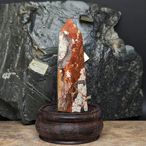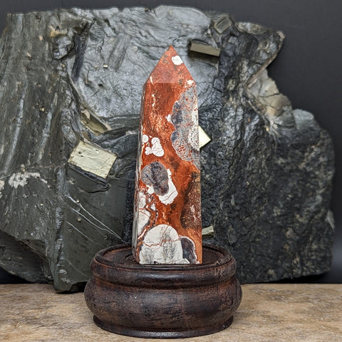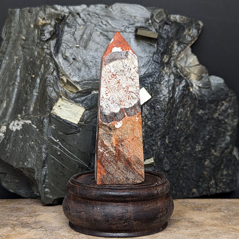 Mushroom Rhyolite Generator~CRMYAG07. Mushroom Rhyolite helps increase self-esteem, & in reducing nightmares & fear of the dark, strengthens the love between animals & children, brings harmony & peace to the family atmosphere, considered a mediator stone, helpful if you have conflict that needs resolution, helps one regain the feeling of being young at heart, assists one in maintaining balance in social areas & protects one from the negativity & depression of others, assists one in being more aware of ones surroundings, regarded as a protective stone from the “evil eye”, effective in removing the effects of black magic, help one adjust & better function on dark, dreary days, overcast days. 77mm x 24mm x 24mm
