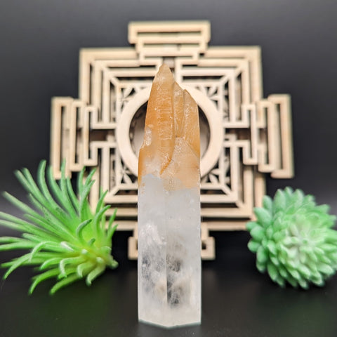 Rutilated Quartz Generator~CRRUTGN2. Fascinating new find of unusual Rutilated Quartz Generators. When the Rutile started growing in the quartz, the quartz stopped growing. When this occurs externally in crystals, they are called "growth Interference crystals". I have never seen consistent internal growth interefence like that occurring in these crystals. Rutilated quartz assists one in making choices in alignment with Divine intention. The “hairs” of rutile act as psychic antenna. It helps one “tune into” another’s “vibe” before becoming involved with that person. It can magnify and accelerate the effects of one’s focused intention. It helps expand one’s consciousness, and maintain one’s resolve. It is an energy amplifier, providing power and clarity to the wearer. It is said to bring the energy of the stars into the soul. It is said to harmonize and align human energies. It can be used to facilitate both speaking with, and receiving information from, the spiritual and other-worldly masters, teachers, and healers. It aids one in reaching and utilizing the talents and abilities of the mind. Rutilated quartz activates one's creative energies and the ability to receive Divine inspiration. It can also assists in removing blockages to health and abundance. This mineral can help one get things moving when one feels stuck, it can help authors overcome writers block and can bring new inspiration. It can "lighten the load" helping one feel less overwhelmed by life's responsibilities. One can "program" quartz with a prayer, making it a constant prayer generator, sending the message and energy of the prayer out into the heavens. The energy of quartz is asking you to clarify yourself so that the universe can provide you with the answers to your prayers. The message is that your are a reflection of the clarity of the Divine mind. 76mm x 21mm x 17mm