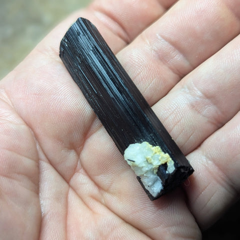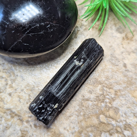 Black Tourmaline & Calcite High Grade Crystal~CRHGBT33. Black tourmaline is an Iron rich grounding stone, grounding out to the magnetic core of the Earth, a stone of purification, absorbing negative energy and transmuting it into neutral, usable energy. The ritual of purification allows time for the redirection of the mind from daily matters to more spiritual planes. It also clears the energy systems of any thoughts or psychic debris that could cause blockages or imbalances if allowed to remain. It is a process of "energetic housecleaning" that is vitally important to anyone who strives for connection to their spiritual path. It can be used to diminish fear by promoting understanding and to encourage self confidence. It has been used by shamans worldwide, the African shaman have used it to awaken from the "dream of illusion". It balances the left and rights sides of the brain enhancing creativity and healing, and helps one release the concept of being the "victim". Black tourmaline asks you "are you holding onto old patterns that no longer serve you"? Or maybe you have been exposed to energies that are preventing you from being centered and focused. It is now time to take a "spiritual bath", to purify yourself and your environment through the use of tourmaline, smudging, sweat lodge or sauna. When you purify yourself and release any obsolete thoughts, beliefs, worries, or resentments, you are making room in your life for spiritual gifts to be received. 61mm x 17mm x 20mm