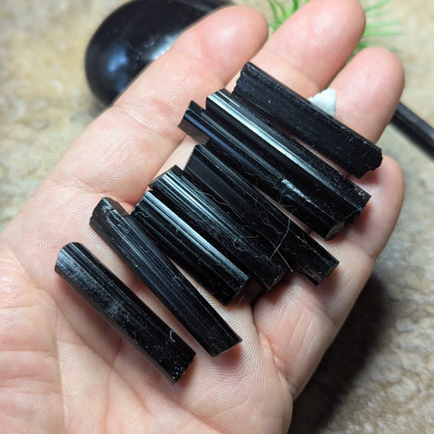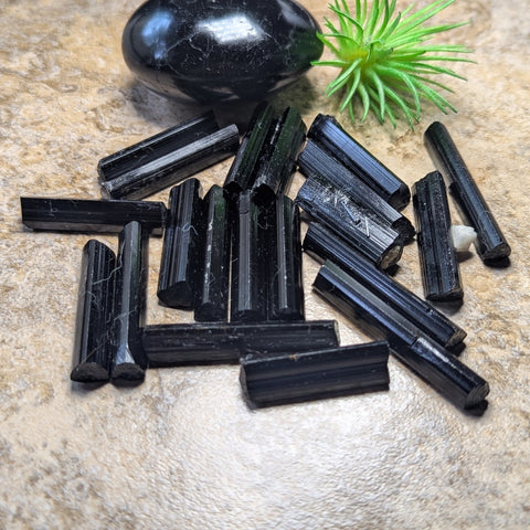 Black Tourmaline High Grade Crystal~CRHQBT08. Black tourmaline is an Iron rich grounding stone, grounding out to the magnetic core of the Earth, a stone of purification, absorbing negative energy and transmuting it into neutral, usable energy. The ritual of purification allows time for the redirection of the mind from daily matters to more spiritual planes. It also clears the energy systems of any thoughts or psychic debris that could cause blockages or imbalances if allowed to remain. It is a process of "energetic housecleaning" that is vitally important to anyone who strives for connection to their spiritual path. It can be used to diminish fear by promoting understanding and to encourage self confidence. It has been used by shamans worldwide, the African shaman have used it to awaken from the "dream of illusion". It balances the left and rights sides of the brain enhancing creativity and healing, and helps one release the concept of being the "victim". Black tourmaline asks you "are you holding onto old patterns that no longer serve you"? Or maybe you have been exposed to energies that are preventing you from being centered and focused. It is now time to take a "spiritual bath", to purify yourself and your environment through the use of tourmaline, smudging, sweat lodge or sauna. When you purify yourself and release any obsolete thoughts, beliefs, worries, or resentments, you are making room in your life for spiritual gifts to be received. One (1) Black Tourmaline High Grade Crystal. Avg. size 42mm x 10mm.