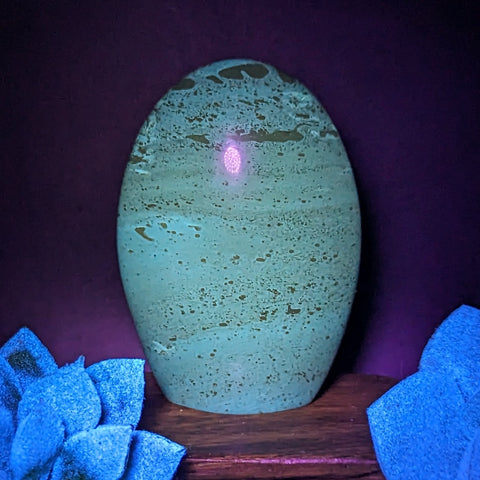 Real Natural Polished Standing Blue Amber Free Form (Indonesia)~This Amber fluoresces blue under UV light...so cool! Blue Amber is considered “solidified sunlight”, a “stone” of sunny days and blue skies, warming us, activating our chi, bringing a sense of strength and security. It acts as a purifier, especially our sacral and throat chakras, transforming negative and stagnant energies into pure, usable energy. It is thought to encourage one’s innate capacity to manifest abundance, and to enhance communication in those endeavors. Amber is a sacred stone to both Native American and Eastern Indians, and was used in fire ceremonies. It can assist one in connecting with other Light beings and light energy. 73mm x 51mm x 26mm