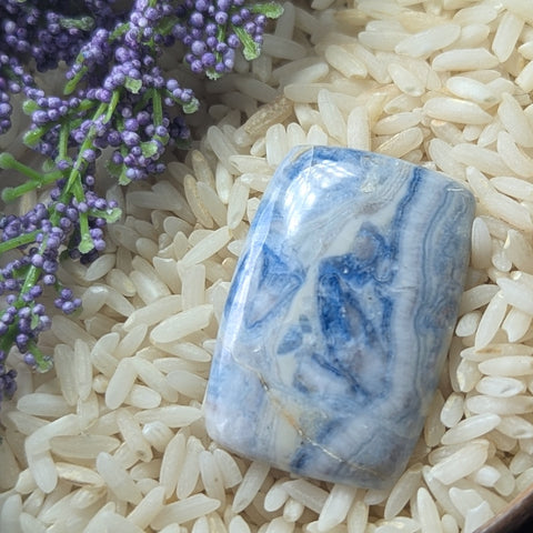 Blue Scheelite Cabochon-Turkey~JCABSCH1. Scheelite represents the coming together of humanity, with all of its diversity. It is extending the flame of one candle to light the next. It represents clarity of intention, connection and community. It is helpful to have in ones energy field to maintain a tranquil, calming energy that will help to feel safe and secure, no matter what the circumstance. For those who are facing inconsolable fears (personal issues, the direction of current events, natural earth based events, etc.) Blue Scheelite will soothe and comfort your fears and any uncertainty. It can also help to ease anxiety, panic and PTSD issues. It is a wonderful supportive companion to those facing addiction and recovery as well. It can remove creative blocks. It enhances connected thought patterns, assisting one in punctuality and in meeting deadlines. It provides for insight into the discovery of “a map to the heavens”, allowing one to pre-determine the destination prior to, or during, astral travel. 3mm x 22mm x 5mm.