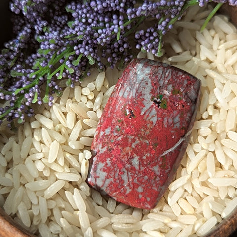 Cuprite Cabochon~JCABCUP7. Cuprite is a powerful root chakra trauma healer. It is a stone of feminine power and empowerment, the Divine feminine, the Earth Goddess. It resonates with the archetypes of the Magician and the High Priestess, and represents the ancient sacred practice of entering the void to be reborn to one's power and potential. It is said to grant one the grace and courage to face the relationships we have with the women in our lives, and our own feminine side. It is considered a stone of fertility on all levels. It is ideal for those who are unable to receive from others, who block themselves from manifesting or feel powerless in having their needs met. 39mm x 24mm x 5mm