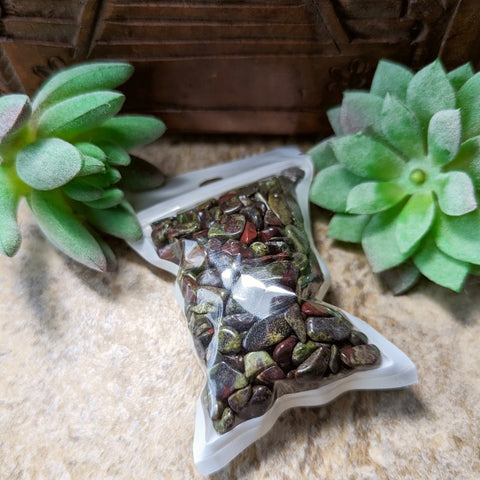 Dragon Stone Polished Chips~CRCDSTON. Dragon Stone is a stone that activates & unlocks the heart. It is known to strengthen & rejuvenate the heart & heal the emotional body. It enhances the rate at which the heart heals, & aids in a reconnection between the mind, heart, & soul. This allows one to speak & feel as one being, & not just scattered feelings and disconnected emotions. Dragon Stone is one of the best stones for anyone who is strictly looking to work on themselves so that they may be better for the ones closest to them. As this stones vibrations imbue your heart with love, courage, and power, you’ll notice yourself radiating that energy to others. It is also a very powerful manifestation tool. It’s a perfect stone to set your intention and pushes one to achieve their goals. It is an energy amplifier, & is particularly grounding for the physical body, especially for healers and bodyworkers. It is thought to bring a lightness to one’s four body system (physical, mental, emotional, spiritual. It encourages self-mastery, aids the young in being courageous and self-reliant. One (1) bag Dragon Stone Chips. 5mm-7mm
