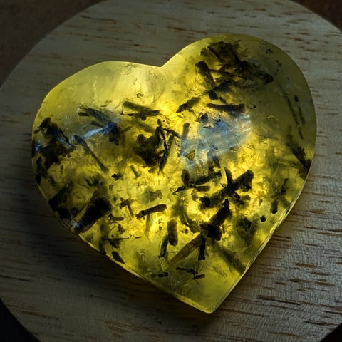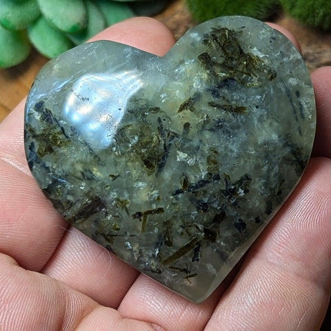 "Heart of Reiki" Epidote in Prehnite Heart~CRCEPHT6. Prehnites' vibration most closely resonates and resembles the energy of Reiki, amplifying energy, shielding, empowering, and enhancing Divine guidance and inner knowing. It is thought to help one remain “present” and promote creative visualization. The meaning of Epidote’s name comes from the Greek word for ‘increase’. Epidote is an attraction stone, so it will manifest that which matches whatever you choose to emanate. If you are loving and romantic, it will attract more love and romance to you. It will enhance the energy of whatever it touches, including other stones. It increases perception and interaction with spiritual beings, and brings spiritual growth. It is a great stone for releasing negativity and raising one's vibrational energy. It is helpful for those stuck in modes of depression, hopelessness, or other negative thinking pattern. It can inject a sense of hopeful optimism into one's emotional body, helping to bring the mind into a higher vibration. Crystal healers like to work with it for its ability to clear congestion and energy blockages in the physical and subtle bodies. It will help to balance and stabilize the energy flow in the body. Epidote is an excellent stone for attunement with nature and her healing qualities. It puts forth a simple, calming, grounding, back to Earth vibration, which is particularly good for those living in a high energy, city setting. It’s also a very powerful dream stone that will give you lucid dreams and very restful sleep. It will help you remember your dreams so that you can apply their messages to your life. 63mm x 58mm x 27mm