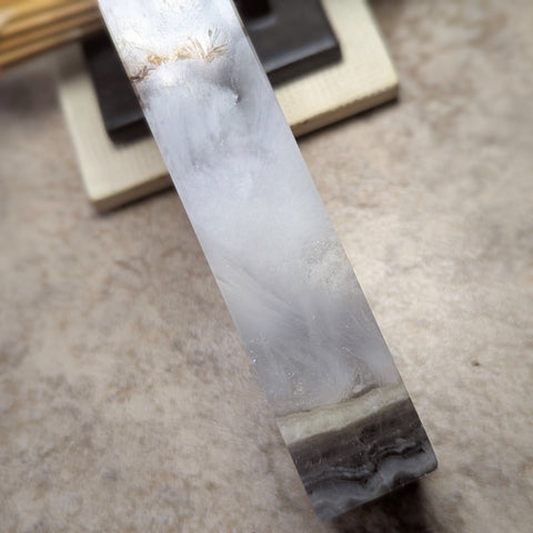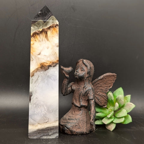 Fluorite, Scolecite & Pyrite Generator (RARE)~CRFSPG03. Purple Fluorite is said to be the most peace-giving color of Fluorite. It is dedicated to the devotional aspects of the mind that connect with Spirit, enhances mental acuity, stimulating the Third Eye Chakra in order to bring a logical & conscious awareness of the mental processes & how one thinks, an excellent crystal for focused meditation & boosts one’s intuitive & psychic abilities, a stone of protection, thought to become more protective the longer it is used, an ideal “Dream Crystal,” defending one from evil spirits & bad dreams, emanates a marvelous energy throughout the light body relieving stress, spiritual discomfort, & physical blockages, considered highly therapeutic for those who are uncomfortable being touched or examined, a dream talisman, providing insight & giving us a window to the soul beyond ordinary understanding, not only the wisdom of self, but focuses on our feelings & understanding our hidden yearnings. Yellow Fluorite may be used for finding “that which is lost”,wonderful for those with overactive imaginations, helping one understand the fine line between attainable dreams & illusions, particularly empowering for overcoming self-defeat or a constant need to compare oneself unfavorably with others, a crystal of unity, intellect and creativity, ideal for cleansing & repair of the auric field, & for activating & energizing all chakras, calms a chaotic mind, meditating with this mineral can help reveal the truth of a relationship, an excellent ally for “Indigo Children” to experience simplicity, safety & love on this dimension. Scolecite is Crown & Soul Star Chakra stone connected to psychic abilities, akashic records, journeying, meditation, & channeling spiritual messages, considered a stone of serenity, resonates with the Reiki symbol Hon Sha Ze Sho Nen, assisting healing sessions, & breaking through the illusory constructs of time & space, acts as an energetic bridge between the heart chakras of romantic partners.Yang energy is outward-focussed, whereas Yin energy is inward-focussed, & promotes self-love & self-healing. If you have spent a significant amount of time in Yang environments, such as high-powered work environments or social events, you may need a good dose of the Yin energy of a stone like scolecite to “recharge.” This is especially important for people who are introverted – that is, who gain their energy from being alone, will speed up the recharging process, helping you gather your energy & calm yourself so that you are focussed & ready for your next social or Yang-focussed activities. Pyrite encourages the flow of Earth energy (a purifier) into the body, increasing physical stamina and mental acuity, aids the process of manifestation & creation on all levels, nicknamed "fools gold", reminding us that "money isn't everything”, assists us in balancing creativity with logic, asks us to employ our "male energy”, & is considered the masculine power stone, a very protective stone, keeping out negative vibrations, shielding on a physical level from harm, repelling pollutants, while energizing the nourishing energies of the body, allows one to recognize the purity of the universe & to understand that each portion (or person) of the universe maintains an inherent perfection in order to allow the unfolding of impeccability, encourages the flawless ideal of health, intellect, & emotional well-being, symbolizes the warmth & lasting presence of the sun & promotes the recall of beautiful memories of love and friendship, assists one in seeing behind facades, promoting understanding of that which lies beneath words & actions. It is also helpful in enhancing memory. 152mm x 35mm x 26mm.