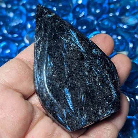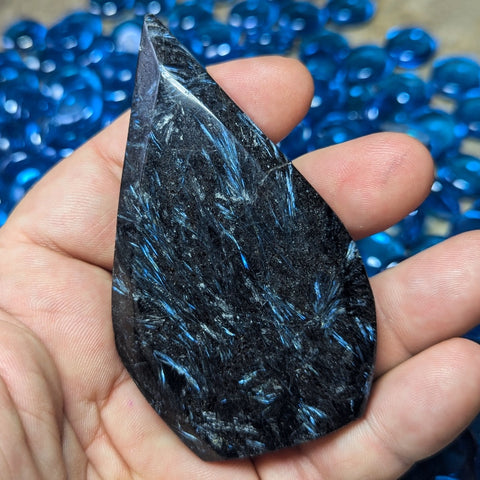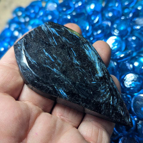 Garnet in Arfvedsonite "Flame"~CRGAFLM3.  Garnet in Arfvedsonite~Arfvedsonite can help open crown chakra, helps us restructure & reorganize old patterns and helps smooth changes in our lives, can help with transitions from one life to another as well as assisting in birth and rebirthing, opens crown chakra & allows for the flowering or the Inner Blue Lotus, can be used to locate energy blockages within the body, As an Iron rich Root Chakra stone, Garnet is very grounding. Garnet has been used as a sacred stone by the Native American Indians, the South American Indians, the Aztecs, the African tribal elders, and the Mayans. It is quite helpful in moods of abandonment, allowing one to realize that surrender to discontinuity brings freshness to ones life. It helps one change ones world by producing both expansiveness in awareness and manifestation. It enhances ones internal fire, bringing the creative powers to the stage of implementation. It is also known as a stone of commitment- to purpose, to others, and to oneself, and reflects the attributes of devotion, bringing the love of others to expressions of warmth and understanding. It reminds us that to surrender to discontinuity brings freshness to ones life. It initiates the remembrance that all life is interconnected and springs from the same source. Seeing the divine in all creation, and re-experiencing the limitless nurturing and provision of the universe are two more "side-effects" of garnet. The rich colors of garnet remind us of the abundance, prosperity, and plenty that the Earth Mother offers to us, if we will open ourselves to receiving them. The Universe is an unlimited resource of energy, supplying you with whatever you need. It is calling you to remember your own worth. It is reminding you that you are an unlimited child of the creative source. Whatever you ask, you shall receive. 94mm x 53mm x 15mm