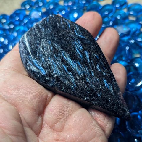 Garnet in Arfvedsonite "Flame"~CRGAFLM4.  Garnet in Arfvedsonite~Arfvedsonite can help open crown chakra, helps us restructure & reorganize old patterns and helps smooth changes in our lives, can help with transitions from one life to another as well as assisting in birth and rebirthing, opens crown chakra & allows for the flowering or the Inner Blue Lotus, can be used to locate energy blockages within the body, As an Iron rich Root Chakra stone, Garnet is very grounding. Garnet has been used as a sacred stone by the Native American Indians, the South American Indians, the Aztecs, the African tribal elders, and the Mayans. It is quite helpful in moods of abandonment, allowing one to realize that surrender to discontinuity brings freshness to ones life. It helps one change ones world by producing both expansiveness in awareness and manifestation. It enhances ones internal fire, bringing the creative powers to the stage of implementation. It is also known as a stone of commitment- to purpose, to others, and to oneself, and reflects the attributes of devotion, bringing the love of others to expressions of warmth and understanding. It reminds us that to surrender to discontinuity brings freshness to ones life. It initiates the remembrance that all life is interconnected and springs from the same source. Seeing the divine in all creation, and re-experiencing the limitless nurturing and provision of the universe are two more "side-effects" of garnet. The rich colors of garnet remind us of the abundance, prosperity, and plenty that the Earth Mother offers to us, if we will open ourselves to receiving them. The Universe is an unlimited resource of energy, supplying you with whatever you need. It is calling you to remember your own worth. It is reminding you that you are an unlimited child of the creative source. Whatever you ask, you shall receive. 95mm x 56mm x 16mm