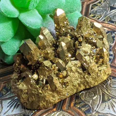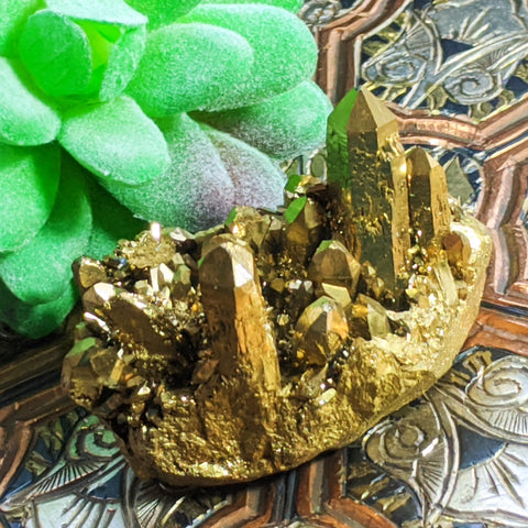 Gold Aura Quartz Cluster~CRGAQC05. Gold Aura Quartz~Gold is the color of the Divine Father Energy. It is associated with Sun, with fire, with the life force in its creative mode. It supports openness and integrity and builds self-confidence. It symbolizes the successful completion of an inner process of growth and the reward for doing so. Gold is associated with worldly knowledge and an understanding of manifestation. It stimulates passion, creativity and sexuality. It can assist in overcoming emotional paralysis and fear, and in moving through difficult circumstances. Clusters are excellent quartz configurations to boost your personal energy, and the larger the number of points in the cluster the stronger the energy will be they send out to you and everyone in the area. They are excellent crystals to use if you are a healer or a teacher, to have in the room to enhance the energy and bring peace and harmony to everyone present, representing a group of individuals, working together towards a common goal. Quartz is an energy amplifier, providing power and clarity to the wearer. It is said to bring the energy of the stars into the soul. It is said to harmonize and align human energies. Quartz can be used to facilitate both speaking with, and receiving information from, the spiritual and other-worldly masters, teachers, and healers. It aids one in reaching and utilizing the talents and abilities of the mind. Quartz worn over the heart can help to clear emotional disturbances from ones being, and enhances self-acceptance and self-love. It also helps to purify the physical, emotional and spiritual bodies, and is a healer of negativity associated with ones perspectives and judgments. It aids one in directing ones energy to toward the spiritual realm, toward the light, love, and harmony of the planet, teaching one to live, laugh, and love with all brothers and sisters. One can "program" quartz with a prayer, making it a constant prayer generator, sending the message and energy of the prayer out into the heavens. The energy of quartz is asking you to clarify yourself so that the universe can provide you with the answers to your prayers. The message is that you are a reflection of the clarity of the Divine mind. 57mm x 34mm x 36mm