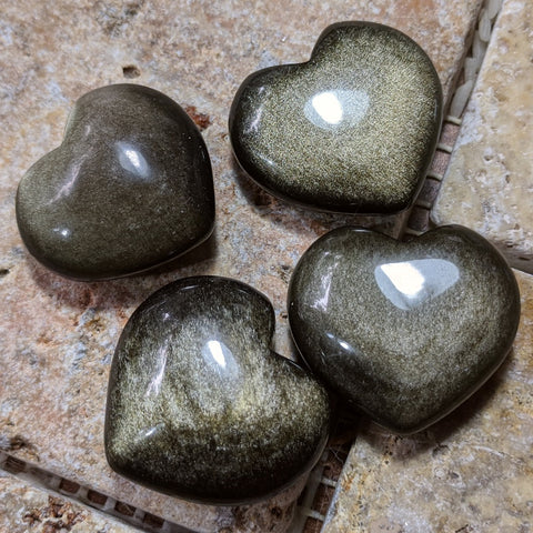 Gold Sheen Obsidian Heart- CRGSOHRT. Gold sheen obsidian provides information concerning the "root" of a problem, excellent for "gazing", can be used to balance the energy fields and to assist one in the elimination of ego conflicts and feelings of futility, reflects that which is needed in ones life, and provides insight into the channels available which could bring fruition to those needs, an excellent grounding and protective stone, provides a shield against negativity(even from oneself), and disperses those unloving thoughts which arise from within the self or are directed towards ones physical form, enhances one's power of manifestation and assists in bringing forth one's hidden talents, a powerful mineral for victims of abuse who want to clear all aspects of power abuse from their energetic bodies, helps one reclaim their personal power, direction, and clarity of purpose for the highest good. One (1) Gold Sheen Obsidian Heart. 30mm x 27mm x 13mm