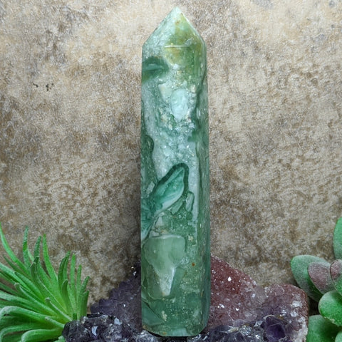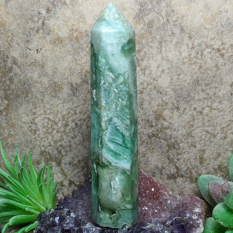 Green Opalized Fluorite~CRGOFL06. Green Opalized Fluorite is basically Tiffany Stone (purple) without the inclusion of Bertrandite. It can help one connect with ones inner self, and ones higher self, ones own empowered heart. It is considered a “stone of attunement”, It can assist one in the transfer of spiritually guided energy and empowerment one to another, or one to objects in nature. It is thought to remind one that the root of all evil is…evil, That prosperity and abundance are your birthright ready to be claimed, that faith truly is the substance of things hoped for (the energy, that when coupled with intent, becomes the matter of manifestation), and the evidence of things unseen (that one’s faith is proof that ones creations are already waiting to be claimed through the process of the Law of Attraction, the mindset of “Ask and it is given”, and the promise of Divine supply). Particularly healing to the Heart Chakra, this mineral permits information to rise from the subconscious, and helps the emotional body understand issues of the heart, both current and of the past. It enables release of emotional trauma and outworn conditioning. It is said to assist one in leaving the chaos and slavery of addictions behind, and allows one to serve purposes of a higher good. Harmonizing the mind with the heart, It helps make certain one’s thoughts, words and actions are aligned with their true purpose. It has a wonderful, stabilizing effect on the emotional body, helping one to “think through” one’s feelings when overwhelmed and dissolves confusion, vacillation, fear of the future, or of making a wrong decision.It is also an excellent crystal for helping one understand the balances intrinsic to relationships. It gives us the balancing ability to be ourselves within the environment. When the Heart Chakra is out of balance we may feel either controlling or controlled in a relationship, and become critical of the little foibles of others. We may find ourselves having inappropriately strong emotional responses to everyday external stimuli. Its energy is used to resolve blockages and to re-balance the Heart Chakra, helping us understand our own needs and emotions clearly while dealing with the ebbs and flows of emotional relationships, understand their cyclic nature, and accept the changes. 97mm x 21mm x 19mm