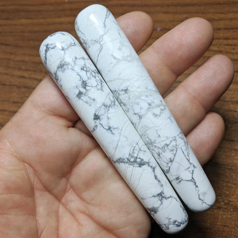 Howlite Wand~CRHDTWND. Howlite is one of the “attunement stones” which link the user to higher spiritual consciousness. It opens and prepares the mind to receive the energies and wisdom of attunements. It is a lovely stone to use when needing to reduce anxiety, tensions and stress. It can be used to facilitate awareness, encourage emotional expression and assist in the elimination of pain, stress and/or rage. It can calm and soothe the emotions, slow the overactive mind and help to achieve a deep and restful sleep. It can help to access/retrieve wisdom during the dream state and bring it back into consciousness upon waking. It brings mental awareness, both to current and past-life issues, and facilitates a calm communication of these issues. Keep a piece of Howlite in your pocket to absorb anger and negative energy. Meditating with it can help one to connect with the higher realms, allowing for greater communication of higher frequencies into the higher chakras, to be assimilated by the unconscious mind, which helps one to slowly remove the veils blocking truth. It strengthens positive character traits, removing selfishness, rude behavior, and greed. One (1) Howlite Wand. 110mm x 20mm.