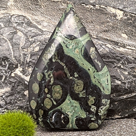 Kambaba Jasper "Flame"~CRKJGSF1. Kambaba Jasper (Green Stromatolite) is fossilized algae & is the primary constituent of the fossil record for about the first 3.5 billion years of life on Earth, they are almost our only glimpse into deep time on earth, the emergence of life, and the evolving of the beautiful forms of life of modern time, a small piece of stromatolites encodes biological activity perhaps spanning thousands of years, aids past-life meditation, said to relieve physical and emotional stress & reestablish the flow of body fluids that have become heavy, blocked, or dried, is said to mystically soothe the nerves and state of mind, good for grounding and protection, beneficial for plant growth and health, helps dietary stabilization, assimilation of vitamins and minerals, and cleansing the body of toxins. 71mm x 47mm x 14mm