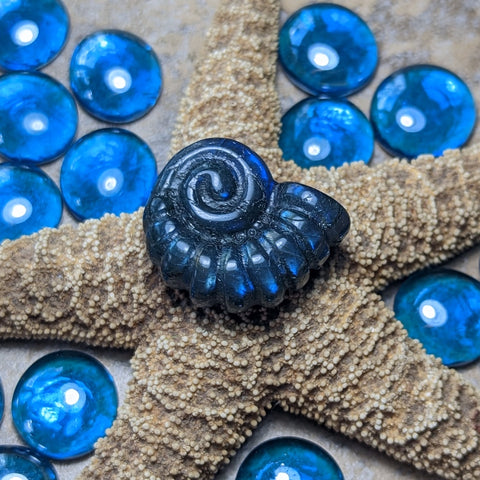 Labradorite Ammonite Carving~CRLABAC3. Labradorite reminds us that thoughts create reality, and positive thinking creates positive emotional states. It is thought to connect one to extraterrestrial energies. It clears, balances, seals and balances the aura. It is said to "shine a light" of illumination on our souls destiny and avocation; to remember your magic, and encourages one to progress upon that path. It is a stone of the mental body, rationality, discernment, and intuition. It assists us and uplift us through the sometimes challenging practice of self-examination and the feelings that can accompany this exploration. It can also assist us in taking action on the guidance we receive through intuition, meditation, and prayer, leading to the understanding and fulfillment of ones destiny. It resonates with the story of Dragon and Dragonfly. One day, Dragon was challenged to prove his power by turning himself into a Dragonfly. After he did this, Dragon forgot his true power and got stuck as Dragonfly. The message of Labradorite is “Remember your magic”! 37mm x 28mm x 18mm