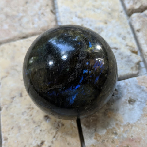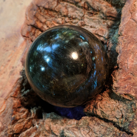 Labradorite Sphere~ CRLABSP1. Labradorite reminds us that thoughts create reality, and positive thinking creates positive emotional states. It is thought to connect one to extraterrestrial energies. It clears, balances, seals and balances the aura. It is said to "shine a light" of illumination on our souls destiny and avocation; to remember your magic, and encourages one to progress upon that path. It is a stone of the mental body, rationality, discernment, and intuition. 53mm