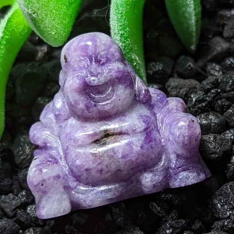 Lepidolite Laughing Buddha~CRLEPILB. The Laughing Buddha emerged from Chinese folktales of the 10th century. The original stories of the Laughing Buddha centered on a Ch'an monk named Ch'i-t'zu, or Qieci, from Fenghua, in what is now the province of Zhejiang. Ch'i-t'zu was an eccentric but much-loved character who worked small wonders, such as predicting the weather. Chinese history assigned the date of 907-923 CE to Ch't'zu's life, which means he lived considerably later than the historical Shakyamuni, the true Buddha. One of the best feng shui locations for a Laughing Buddha is close to the front door so that you can see it as you come home. Laughing Buddha is considered to be a patron of children. Laughing Buddha is used in feng shui to bring good luck, abundance, happiness, success, good health; any feng shui bagua area can benefit from the sparkling energy of the Laughing Buddha. Lepidolite's lithium content is said to enhance feelings of peace, serenity, relaxation, calm and love, and is an ally for those wishing to increase their sense of well-being. It is thought to clear the auric and mental bodies, calming the energetic "voices" of past experience and past fears. 31mm x 29mm x 18mm