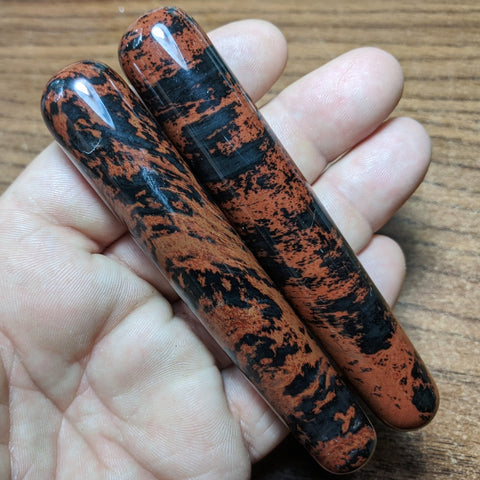 Mahogany Obsidian Wand~CRMOBWND Mahogany Obsidian (volcanic glass) is said to act to cleanse the energetic field or aura of disharmonious energy, densities, and negative attachments. It is thought to be very grounding and protective and also assist one in choosing behaviors that are only for one's highest good. Mahogany Obsidian is especially grounding because of the inclusion of iron. Obsidian has also been used for scrying, or crystal gazing, helping to show us what needs our attention in the moment. It can also assist with ease of critical thinking, particularly in emotional areas, so that emotional thinking becomes stabilized and more rational. One (1) Mahogany Obsidian Wand. 110mm x 20mm.