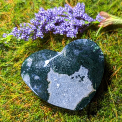 Moss Agate Heart~CRMADH01. Moss agate is considered a stone of balance and stability. It is thought to enhance concentration, persistence, and endurance. It has been used as an amplifier in meditation for ones intentions and goals, and as such is considered a stone of prosperity. It is said to cut karmic cords and patterns from past lives. It has been used to improve self-worth and self-esteem. 57mm x 45mm x 20mm