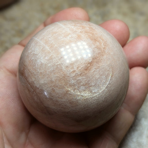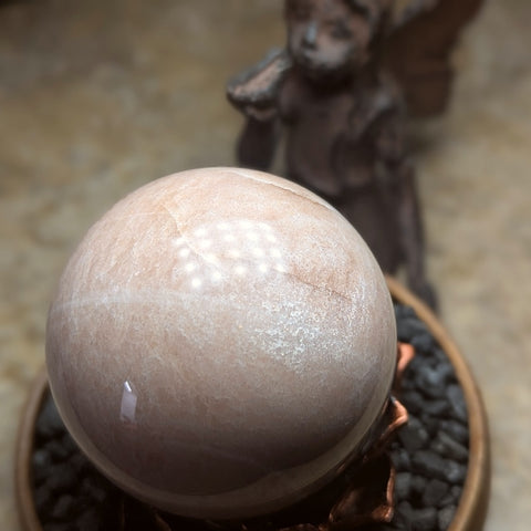 Peach Moonstone Sphere~CRPEACHM. Has nice flash on two sides! Peach Moonstone is said to help calm responses and avoid overreaction, helping one feel balanced during changing aspects in your life. It enhances feminine energies, sensitivity, intuition, and psychic abilities; a highly intuitive stone allowing self expression and creativity to flow. It is also associated with love of all kinds. When the moon is waning it helps one to look into the future. It opens up the Heart and allows the energy to heal the lower Chakras. It can be especially helpful for Indigo children. 58mm.