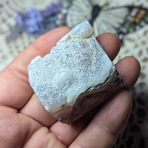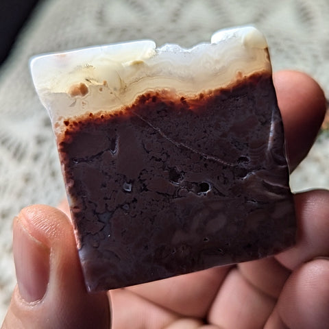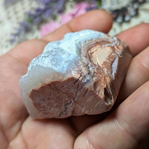 Pink Agate Free Form~CRPAFF03. Pink Agate is a grounding stone that brings balance emotionally, physically, & intellectually; harmonizing the Yin & Yang, enhances mental function and improves concentration, perception, & analytical abilities, helps one to overcome negativity & bitterness of the heart, associated with parental love & is said to be beneficial in strengthening the bond between parent & child. 48mm x 48mm x 31mm