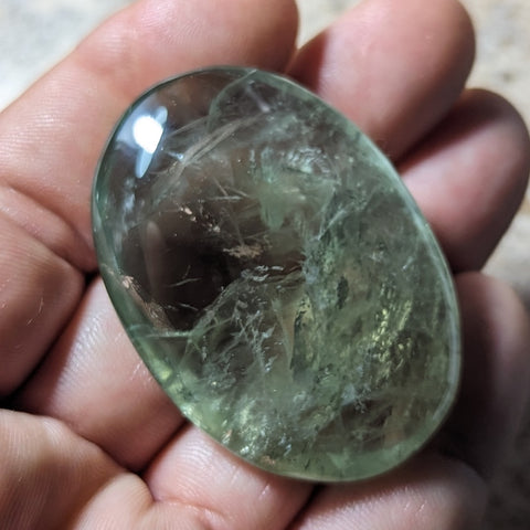 Prasiolite Palm Stone (Green Amethyst)~CRPRASP4. Prasiolite is a stone of the heart and crown chakras. It is considered a stone of Namaste’, the recognition of the Divine spark in others, the commitment to see beyond the image people present, to see the true, limitless, magnificent, powerful beings they really are, to mirror this reality to them,  to help them realize (make real again) and recognize (know again) this truth about themselves. It is a stone of spiritual healing, assisting in clearing before dis-ease manifests in the higher levels of our mental, emotional, or physical bodies. This stone symbolizes the process of walking through the fires of purification, emerging out the other side, and guiding others to do the same. 55mm x 40mm x 18mm