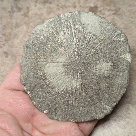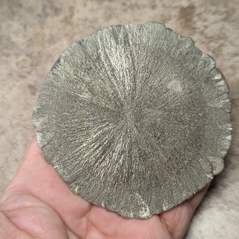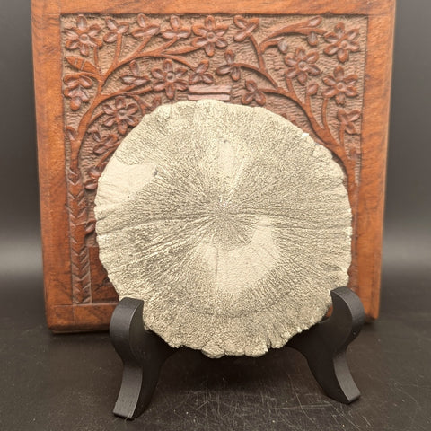 Natural Pyrite Sun with wood stand~CRPYRSN1. Pyrite Suns, also called Pyrite Dollars, Miner’s Dollars, or Sun Dollars. They formed deep underground in ancient, low-oxygen lagoons or swamps around 300-350 million years ago. They formed under great pressure compresses pyrite-rich shale layers between coal seams, forcing the mineral to grow outward in a radiating, flattened disk shape. Although pyrite is quite common worldwide, the disk form is virtually unique to Illinois. Pyrite encourages the flow of Earth energy (a purifier) into the body, increasing physical stamina and mental acuity. It aids the process of manifestation and creation on all levels. Pyrite is nicknamed "fools gold", reminding us that "money isn't everything". Because of its many forms, it assists us in balancing creativity with logic. It asks us to employ our "male energy". Pyrite itself is a very protective stone, keeping out negative vibrations, shielding on a physical level from harm, repelling pollutants, while energizing the nourishing energies of the body. It allows one to recognize the purity of the universe and to understand that each portion (or person) of the universe maintains an inherent perfection in order to allow the unfolding of impeccability. It encourages the flawless ideal of health, intellect, and emotional well-being. It symbolizes the warmth and lasting presence of the sun and promotes the recall of beautiful memories of love and friendship. It assists one in seeing behind facades, promoting understanding of that which lies beneath words and action. It is also helpful in enhancing memory. 100mm x 98mm x 8mm