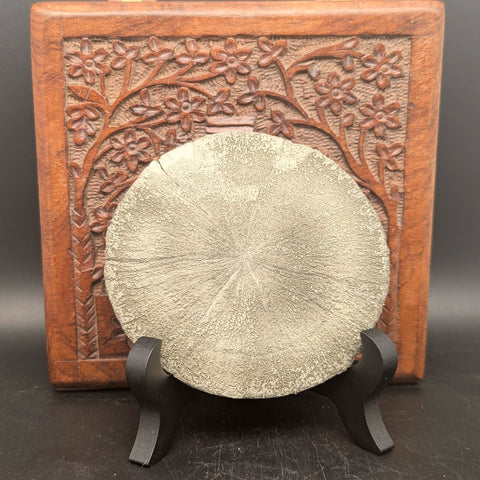 Natural Pyrite Sun with wood stand~CRPYRSN2. Pyrite Suns, also called Pyrite Dollars, Miner’s Dollars, or Sun Dollars. They formed deep underground in ancient, low-oxygen lagoons or swamps around 300-350 million years ago. They formed under great pressure compresses pyrite-rich shale layers between coal seams, forcing the mineral to grow outward in a radiating, flattened disk shape. Although pyrite is quite common worldwide, the disk form is virtually unique to Illinois. Pyrite encourages the flow of Earth energy (a purifier) into the body, increasing physical stamina and mental acuity. It aids the process of manifestation and creation on all levels. Pyrite is nicknamed "fools gold", reminding us that "money isn't everything". Because of its many forms, it assists us in balancing creativity with logic. It asks us to employ our "male energy". Pyrite itself is a very protective stone, keeping out negative vibrations, shielding on a physical level from harm, repelling pollutants, while energizing the nourishing energies of the body. It allows one to recognize the purity of the universe and to understand that each portion (or person) of the universe maintains an inherent perfection in order to allow the unfolding of impeccability. It encourages the flawless ideal of health, intellect, and emotional well-being. It symbolizes the warmth and lasting presence of the sun and promotes the recall of beautiful memories of love and friendship. It assists one in seeing behind facades, promoting understanding of that which lies beneath words and action. It is also helpful in enhancing memory. 99mm x 95mm x 8mm