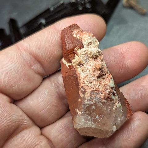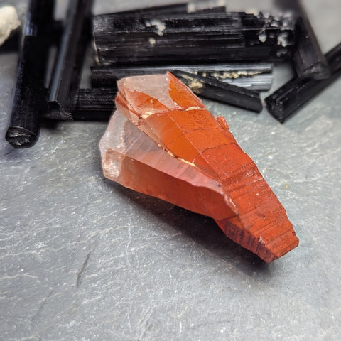 Red Hematoid Self Healed Quartz Cluster~Tarya Mine, Morocco~CRRHQM23. Red Hematoid Quartz is the ‘Stone of the Seeker’, a key to open many doors within and all around, a stone that can be called upon when seemingly all else fails, or when there is confusion of what other crystal or mineral to connect with, it attracts its keeper to genuine source, a stone that helps stop one misjudging, as well as being misjudged, helps one to stand out of the crowd, to be different in a positive way, said to help diminish and lower negative and harmful rays or frequencies such as electro-magnetic fields and frequencies, also known as EMF. Self Healed Quartz Crystals have suffered in major seismic activity. The crystals break, and end up repairing themselves. These are are called “Master Self Healed Quartz Crystals”. As the name would suggest, Self Healed Quartz Crystals assist us in the art of self healing! Meditate with one and the crystal may share the journey it took to healing itself, and share this information with you on spiritual, emotional and physical cellular/crystalline levels. This shared knowledge and experience can bring about vastly accelerated levels of healing and regeneration within the self. 61mm x 33mm x 27mm
