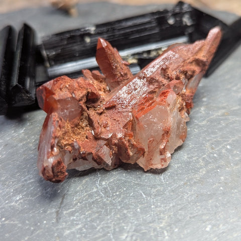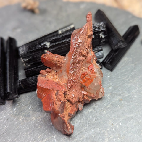 Red Hematoid Quartz Cluster~Tarya Mine, Morocco~CRRHQM24. Red Hematoid Quartz is the ‘Stone of the Seeker’, a key to open many doors within and all around, a stone that can be called upon when seemingly all else fails, or when there is confusion of what other crystal or mineral to connect with, it attracts its keeper to genuine source, a stone that helps stop one misjudging, as well as being misjudged, helps one to stand out of the crowd, to be different in a positive way, said to help diminish and lower negative and harmful rays or frequencies such as electro-magnetic fields and frequencies, also known as EMF. 70mm x 42mm x 28mm