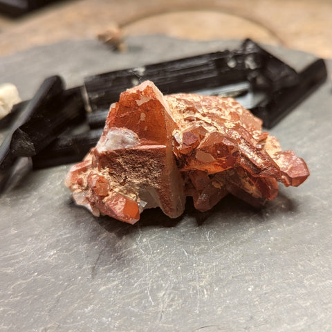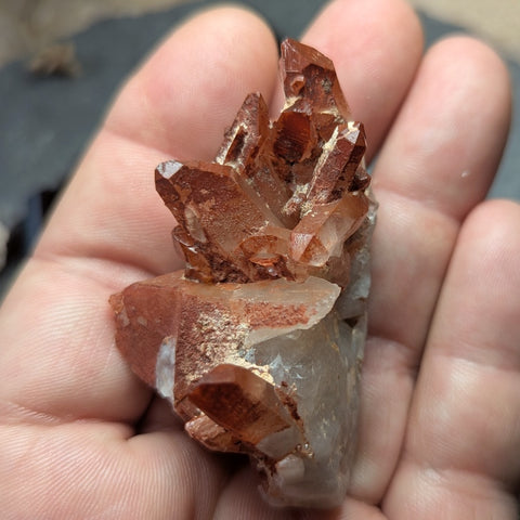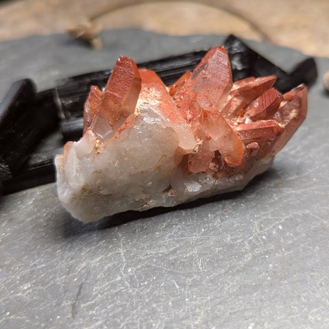 Red Hematoid Quartz Cluster~Tarya Mine, Morocco~CRRHQM25. Red Hematoid Quartz is the ‘Stone of the Seeker’, a key to open many doors within and all around, a stone that can be called upon when seemingly all else fails, or when there is confusion of what other crystal or mineral to connect with, it attracts its keeper to genuine source, a stone that helps stop one misjudging, as well as being misjudged, helps one to stand out of the crowd, to be different in a positive way, said to help diminish and lower negative and harmful rays or frequencies such as electro-magnetic fields and frequencies, also known as EMF. 61mm x 36mm x 42mm