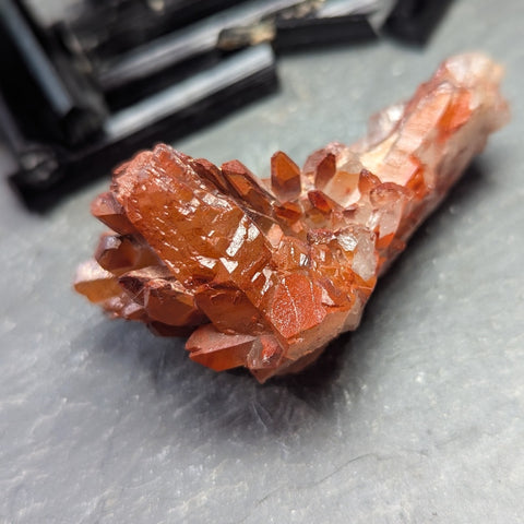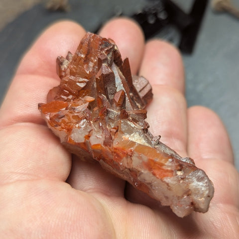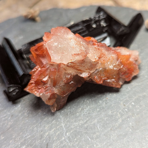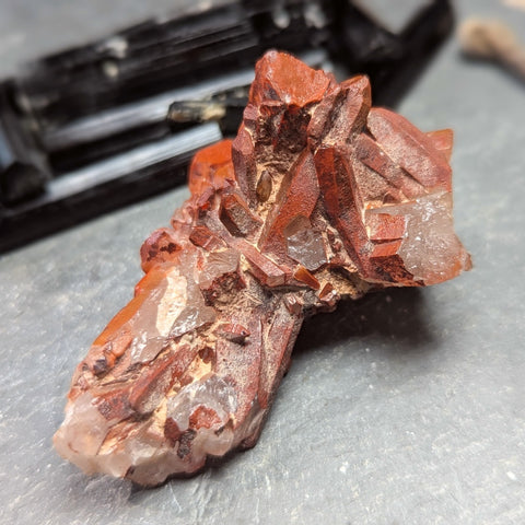Red Hematoid Quartz Cluster~Tarya Mine, Morocco~CRRHQM26. Red Hematoid Quartz is the ‘Stone of the Seeker’, a key to open many doors within and all around, a stone that can be called upon when seemingly all else fails, or when there is confusion of what other crystal or mineral to connect with, it attracts its keeper to genuine source, a stone that helps stop one misjudging, as well as being misjudged, helps one to stand out of the crowd, to be different in a positive way, said to help diminish and lower negative and harmful rays or frequencies such as electro-magnetic fields and frequencies, also known as EMF. 69mm x 45mm x 38mm