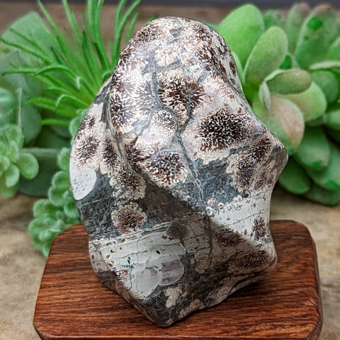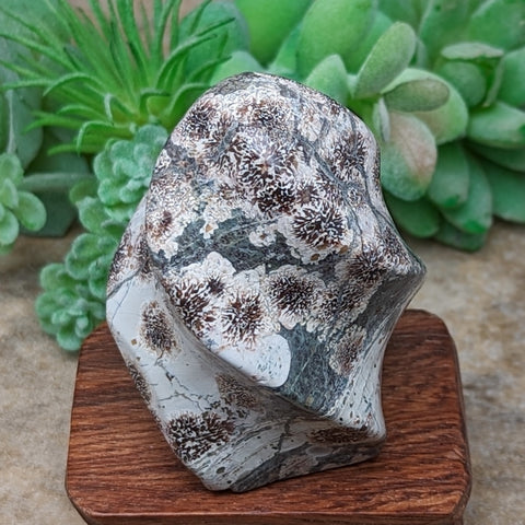 Rhyolite "Flame"~CRRHYFLM. Rhyolite helps narrow your focus to what's really important; following your bliss, it reminds us that achieving a state of bliss is about perspective-you are what you think about, considered a stone of creativity at our deepest level, bringing our limitless potential and talents to the surface. It is thought to bring comfort, clarity, and protection during the process of resolving past issues. It is said to help us remain grounded and rooted in meditative practices. 68mm x 53mm x 52mm.