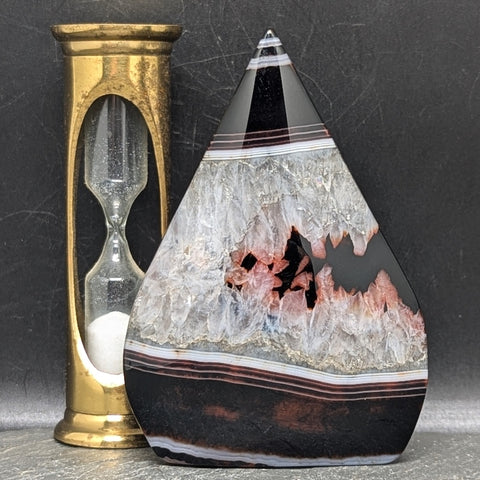 Sardonyx Flame~CRSARDF8. Sardonyx is a highly protective stone that embodies a vibration of happiness, optimism and confidence. It helps to boost your self control and your level of personal power. Sardonyx aids in communication, especially within ones family. It belongs to the foundation stones of the new Jerusalem and was as revered as the gold of antiquity. This stone creates an excellent grounding action through the earth, base and sacral chakras, and brings you back to earth after spiritual work. It is excellent for encouraging motivation, willpower, discipline and strength of character. This makes it a good stone for anyone studying, or if you work in a job where you require mental discipline to focus on the task at hand. Sardonyx has long been used in rituals and has been a stone used in the breast plates of high priests since antiquity. Primarily used in protection rituals, in ancient Rome, it would have been used with a figure of Hercules or Mars engraved upon it. Sardonyx stimulates our striving for a meaningful existence. It increases willpower and strengthens a virtuous character which in turn makes us more friendly and helpful. Sardonyx helps in absorbing information which intensifies our perception of things around us. This brings about a greater understanding of things that happen around us on a daily basis. 90mm X 63mm X 28mm
