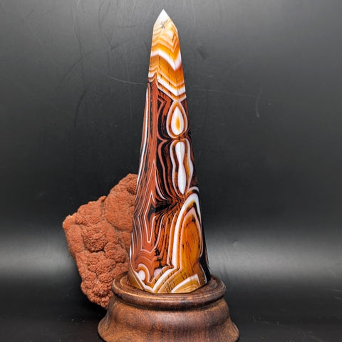 Sardonyx Obelisk~CRSARDO1. Sardonyx is a highly protective stone that embodies a vibration of happiness, optimism and confidence. It helps to boost your self control and your level of personal power. Sardonyx aids in communication, especially within ones family. It belongs to the foundation stones of the new Jerusalem and was as revered as the gold of antiquity. This stone creates an excellent grounding action through the earth, base and sacral chakras, and brings you back to earth after spiritual work. It is excellent for encouraging motivation, willpower, discipline and strength of character. This makes it a good stone for anyone studying, or if you work in a job where you require mental discipline to focus on the task at hand. Sardonyx has long been used in rituals and has been a stone used in the breast plates of high priests since antiquity. Primarily used in protection rituals, in ancient Rome, it would have been used with a figure of Hercules or Mars engraved upon it. Sardonyx stimulates our striving for a meaningful existence. It increases willpower and strengthens a virtuous character which in turn makes us more friendly and helpful. Sardonyx helps in absorbing information which intensifies our perception of things around us. This brings about a greater understanding of things that happen around us on a daily basis. 149mm X 46mm X 39mm