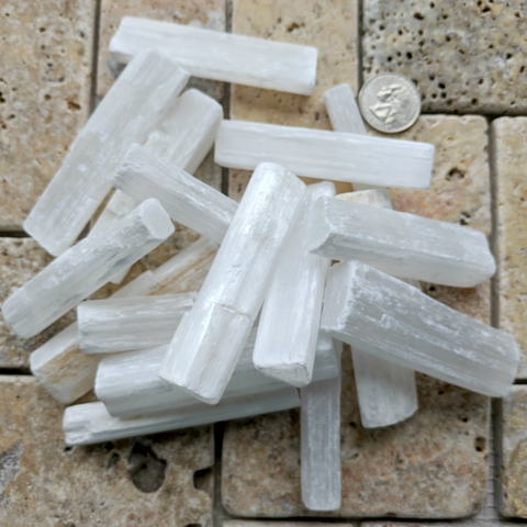 Small Selenite Sticks CRSSTICS. Selenite assists us in connecting to the information stored in the akashic records and in past-life exploration. It is said to raise our consciousness, and to bring that energy to the Earth plane. It is thought to create a "harmony grid" around oneself or in one's environment. Selenite has been used as "magic wands" or "prayer sticks", which carry one's intentions and thoughts to the Higher Self and beyond. One (1) Small Selenite Stick. Avg. size 80mm x 20mm x 18mm