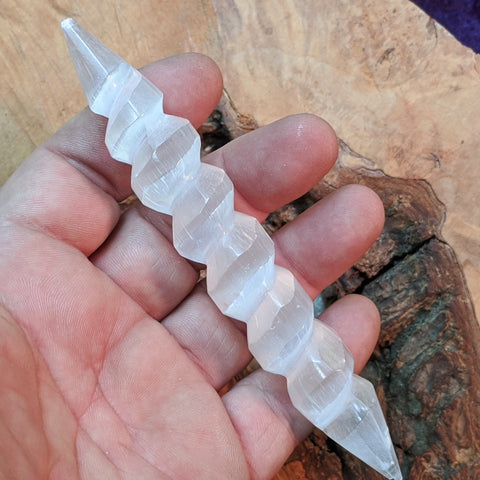 Selenite Wand-Spiral~ CRSWANDS. Selenite assists us in connecting to the information stored in the akashic records and in past-life exploration. It is said to raise our consciousness, and to bring that energy to the Earth plane. It is thought to create a "harmony grid" around oneself or in one's environment. Selenite has been used as "magic wands" or "prayer sticks", which carry one's intentions and thoughts to the Higher Self and beyond. One (1) Large Selenite Spiral Wand. Avg. size 150mm x 24mm