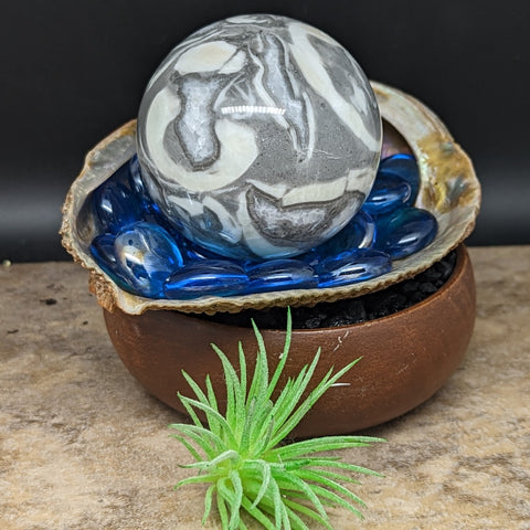 Shell Marble Sphere~CRSHMSP2. Shell Marble is often mis-identified as jasper. It is a beautiful mottled black, white, and gray colored patterns featuring distinctive cross-sections of fossil brachiopods in metamorphosed marble with swirls of limestone, chert, and other impurities. It is thought to assist meditation, encouraging on to expand one's consciousness. It is considered an ally for clarity and memory for all facets of past life work. It is also thought to assist one in connecting with one's spirit guides. 61mm