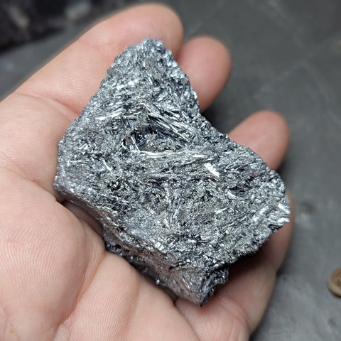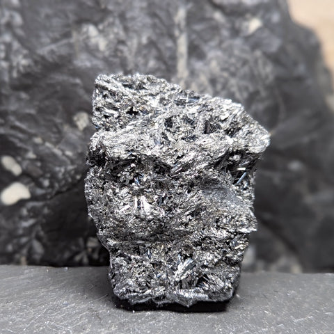Stibnite Cluster~China~CRSTIB06. Stibnite is the totem stone of Wolf medicine, magnetizes experiences, people, and synchronicities to fulfilling ones highest intentions, assists one in shifting into resonance with the high frequency energy we are now being asked to carry in our bodies and in counteracting the symptoms of those energy shifts, can help release fear of spiritual exploration, cleanses emotional debris. 55mm x 46mm x 44mm