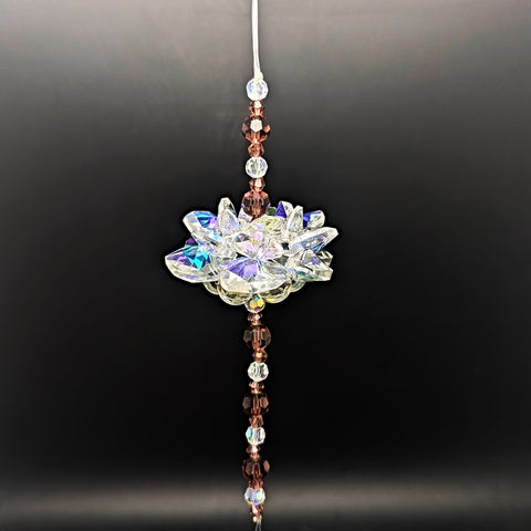 Suncatcher #4 Ruby Slippers~SUNCATRS. Beautiful red, clear aurora borealis rainbow and clear faceted ball sparkly Suncatcher. 12 1/2 inches long.