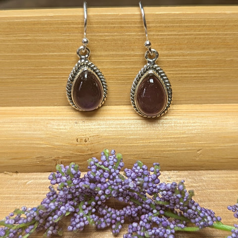 Sterling Silver Amethyst Earrings~JSSAMEE3. Amethyst is said to be a "stone of spirituality and contentment". It encourages conscious connection with our Higher Self and Divine Mind, allowing understanding of the spiritual lessons of the situations you have created to become apparent. It also transmutes lower energies( rage, jealousy, fear) into higher energies of patience, tolerance, self acceptance, faith. Amethyst bestows stability, strength, invigoration, and peace; the peace being the perfect peace which was present prior to birth. Because of the calming effect it is an excellent stone for meditation. It promotes fairness and flexibility in decisions and enhances the ability to manage responsibilities. It helps sooth ones temperament, and helps ones business prosper. Amethyst aids in opening ones mind to new ideas, new emotional attitudes, and new depths of spirituality. It is said to encourage sobriety, and is helpful for freeing one from addictive personalities. The message of amethyst is to pay attention to messages your Higher Self may be sending you, maybe a new book, new job, new relationship-with another, with yourself, or with your spirituality, and to be open to Divine guidance. 29mm x 12mm x 6mm.