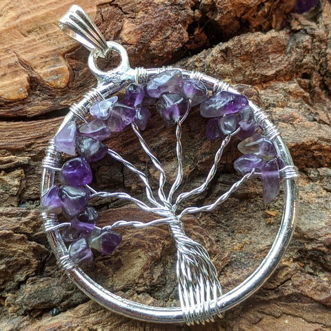Amethyst Tree Pendant~JSPWRATP. Amethyst is said to be a "stone of spirituality and contentment". It encourages conscious connection with our Higher Self and Divine Mind, allowing understanding of the spiritual lessons of the situations you have created to become apparent. It also transmutes lower energies( rage, jealousy, fear) into higher energies of patience, tolerance, self acceptance, faith. Amethyst bestows stability, strength, invigoration, and peace; the peace being the perfect peace which was present prior to birth. Because of the calming effect it is an excellent stone for meditation. It promotes fairness and flexibility in decisions and enhances the ability to manage responsibilities. It helps sooth ones temperament, and helps ones business prosper. Amethyst aids in opening ones mind to new ideas, new emotional attitudes, and new depths of spirituality. It is said to encourage sobriety, and is helpful for freeing one from addictive personalities. The message of amethyst is to pay attention to messages your Higher Self may be sending you, maybe a new book, new job, new relationship-with another, with yourself, or with your spirituality, and to be open to Divine guidance. 47mm x 36mm x 5mm