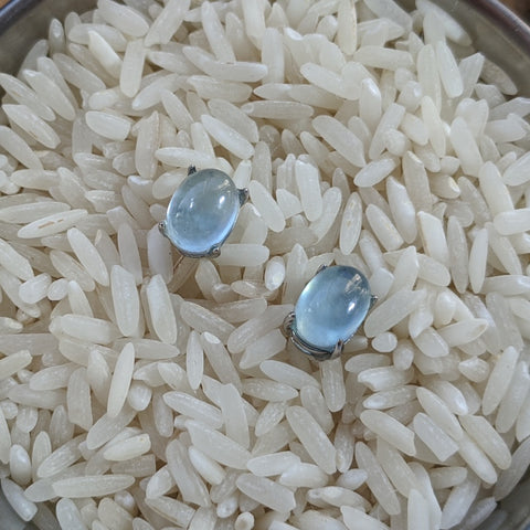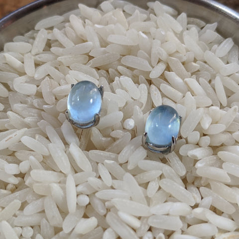 Sterling Silver Aquamarine Post Earrings (blue beryl) JAQUAMER. Aquamarine is known for its ability to stabilize and harmonize unsettled surroundings. It filters out unnecessary information, sharpens the intellect, and calms the nerves. It is known as a stone of courage, reducing fears, and is especially helpful for sensitive people. It sharpens intuition, better enabling you to interpret your emotions. It increases creativity and brings about a tolerance of others, emitting a gentle and compassionate energy supporting moderation. Aquamarine aids deeper meditation, quiets the mind, and brings about a tolerance of others. It will also help to attune you to nature and to more spiritual levels of awareness, enhancing connection to source/creator. It is known to bring order out of chaos to people feeling overwhelmed by responsibilities, like the weight of the world is on your shoulders. It lends one the courage and clarity to express one’s inner knowing. It helps free oneself of attachments to old patterns, relationships and ways of being. It can assist those who keep emotional scorecards or grudges to let go of the past. It is an excellent stone for working with grief, as it assists one in fully releasing attachment to the body of a loved one, while retaining a positive emotional connection to the loved one’s spiritual being. It helps one understand where one is holding on to emotions, communication patterns, or thoughts that are limiting one’s ability to “go with the flow”. It can help one identify where ego is causing one to overreact, assume  a victim, abuser, or rescuer role, act in a passive-aggressive manner, manipulate others, or martyr oneself. By identifying these patterns and consciously releasing them, one can raise one’s relationships and communication to a level that is more reflective of Divine Love and compassion. It also assists one in clearing patterns caused by past emotional, physical or verbal abuse. It is an excellent stone for people who have been through traumatic situations and have disassociated from their emotional bodies. One of the most powerful properties of this stone is in aiding and raising communication to a higher level, and encourages a "go with the flow" attitude. 8mm x 6mm